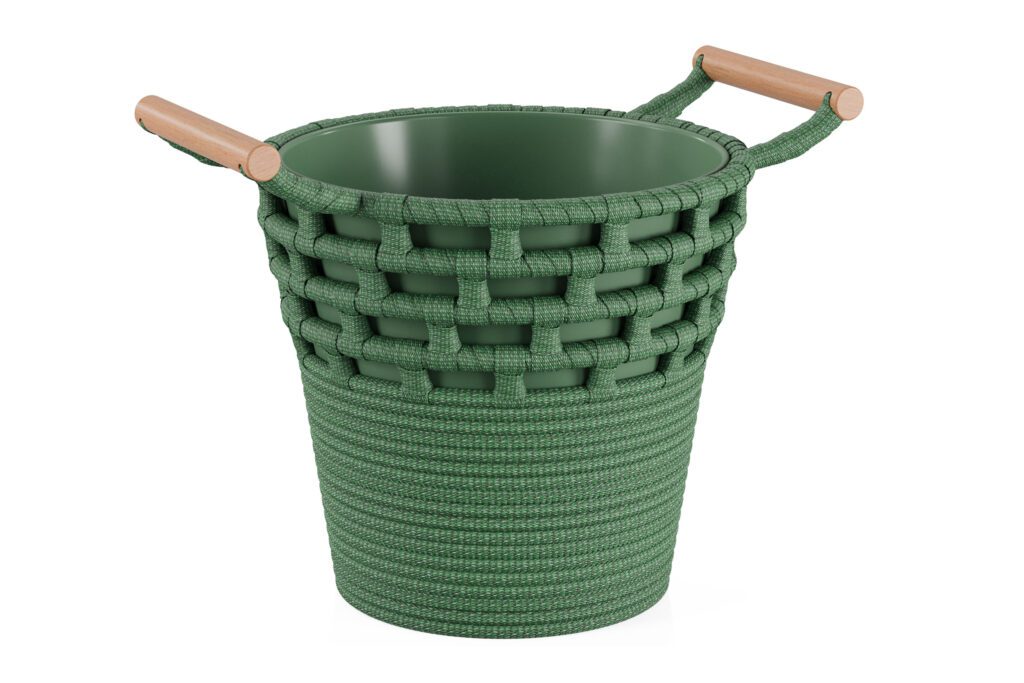Uma estrutura robusta de alumínio é revestida com corda náutica trançada à mão, com alças de madeira que adicionam um toque natural e acolhedor.