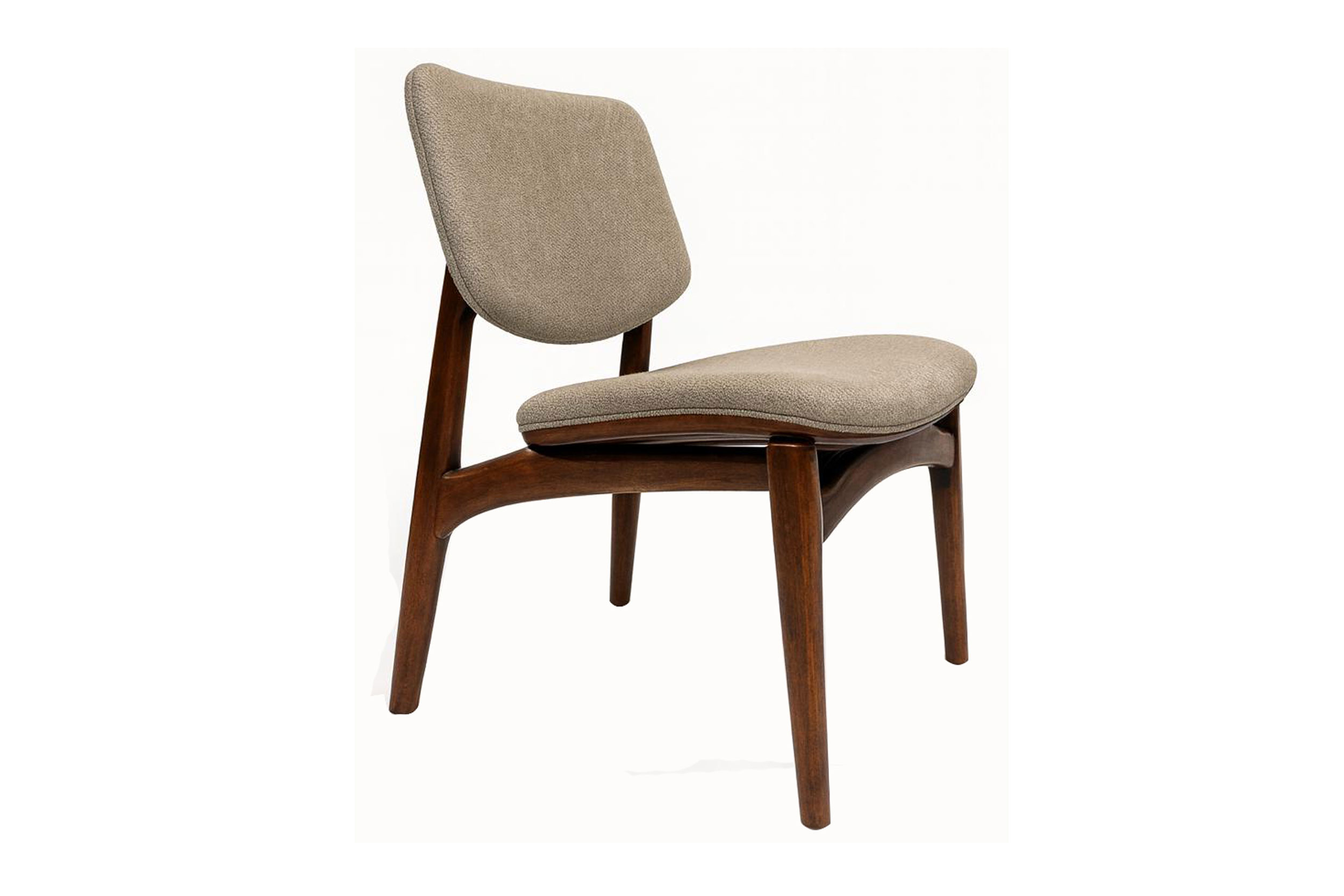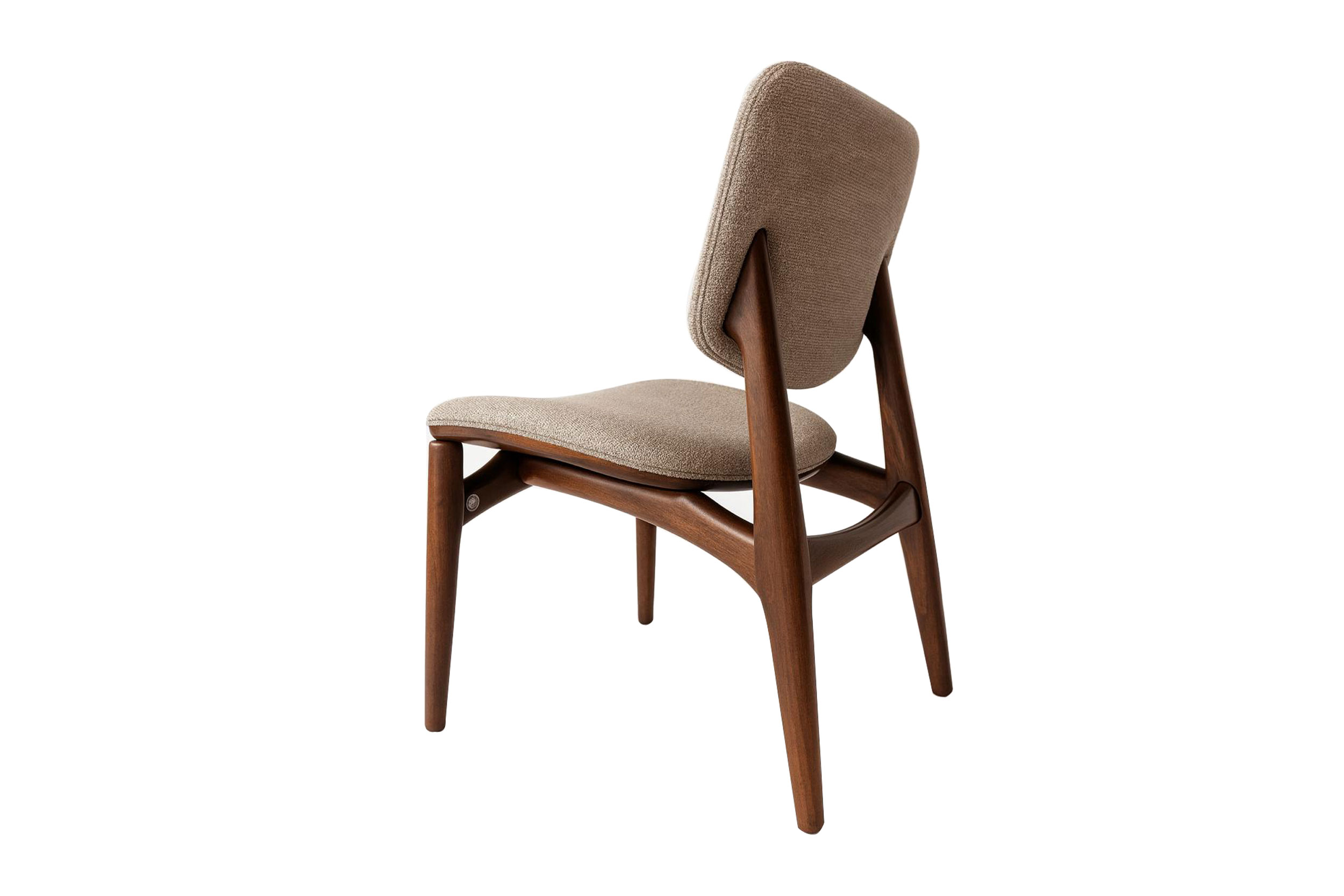 A madeira possui um trabalho de marcenaria refinado, com pés traseiros levemente angulados que se unem à base do assento em uma curva suave. Isso garante estabilidade sem perder a elegância.