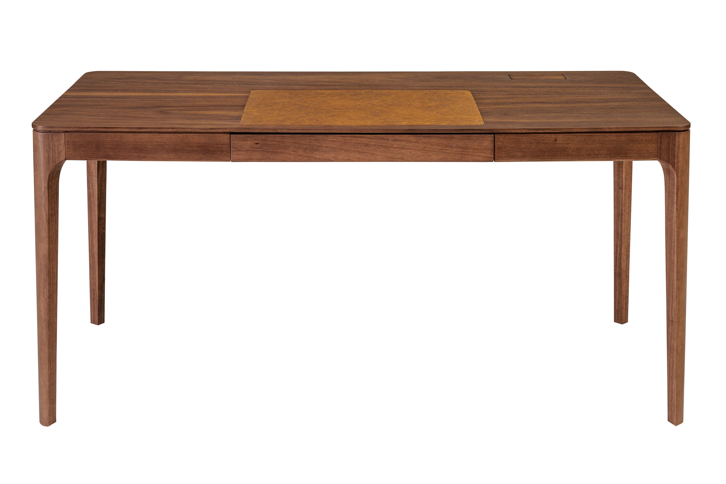As gavetas da Escrivaninha Cromos são embutidas na própria estrutura do tampo (saia), mantendo o perfil fino, elegante e discreto, contudo sem abrir mão da funcionalidade para guardar itens de papelaria ou um laptop.