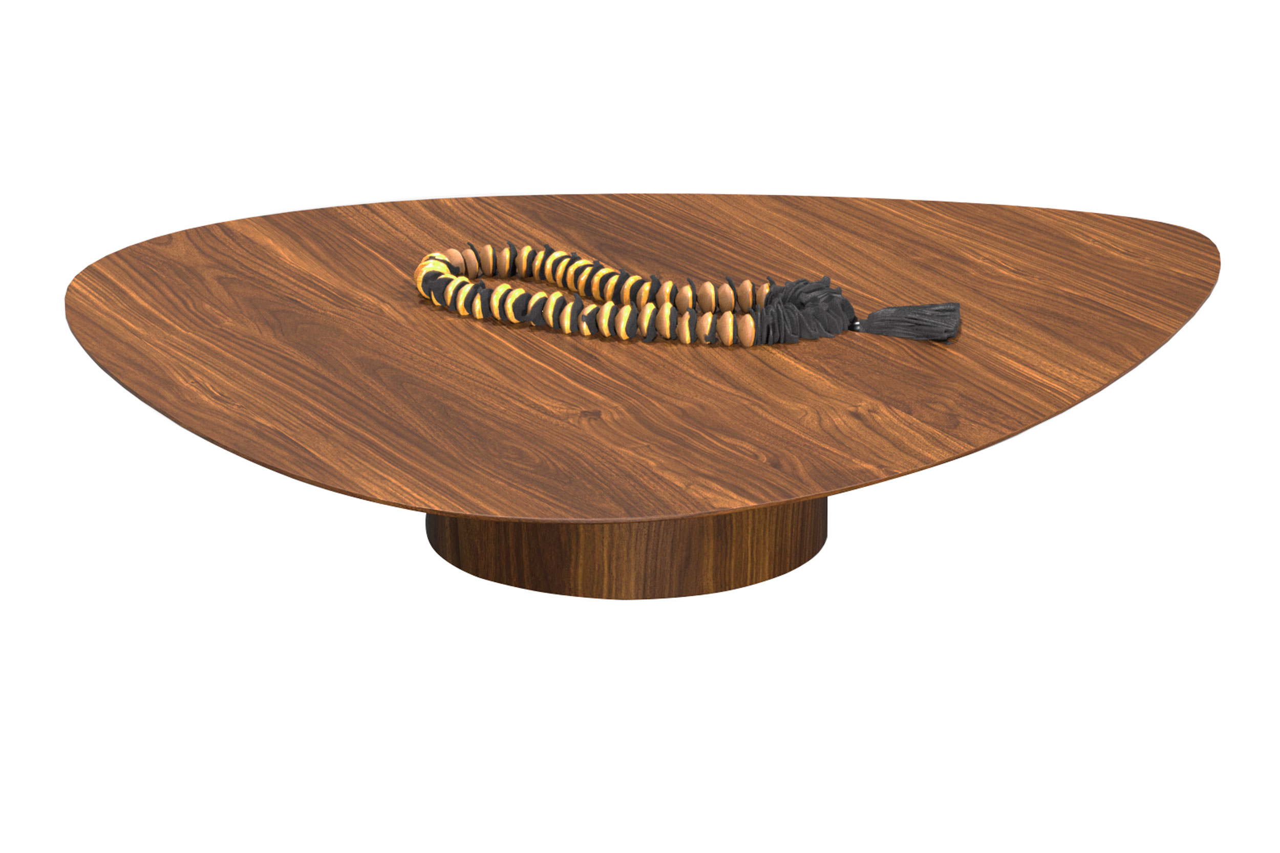 Descritivo: O desenho derivado da mesa de centro com o mesmo nome, possui seu formato inspirado nas palhetas utilizadas para pinçar as cordas de instrumentos musicais. Sua proposta é ser um móvel moderno e funcional. Possui uma base cilindrica que trás solidez ao produto. Sua forma é minimalista e foi pensada para compor um ambiente cheio de personalidade.