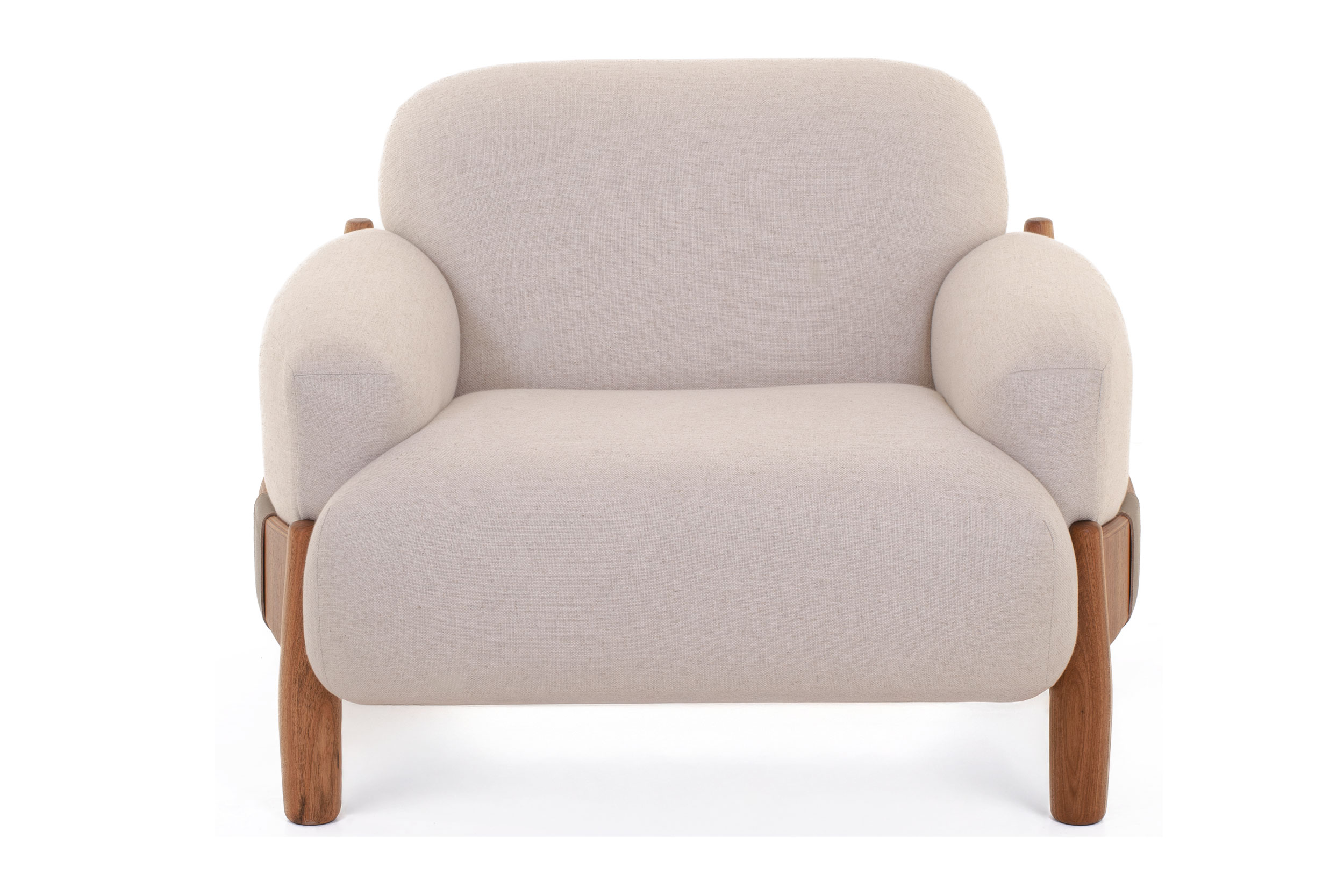 A peça utiliza um contraste elegante entre a leveza do estofado e a estrutura de madeira maciça aparente.