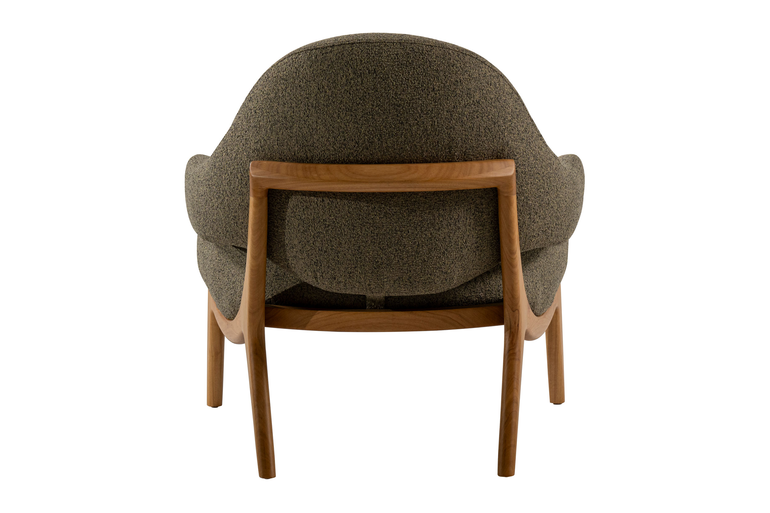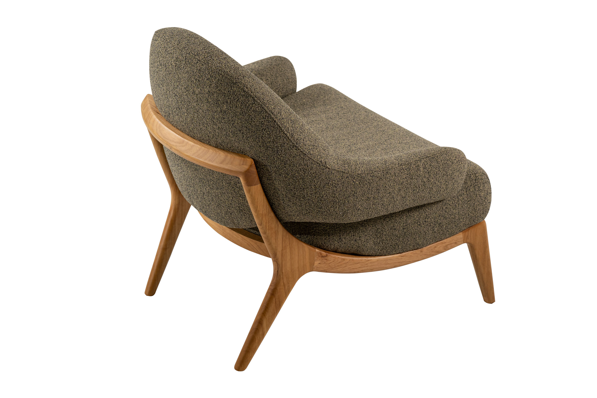 O encosto e os braços formam uma peça única, com curvas que fluem sem interrupções, eliminando arestas rígidas e promovendo uma estética suave.