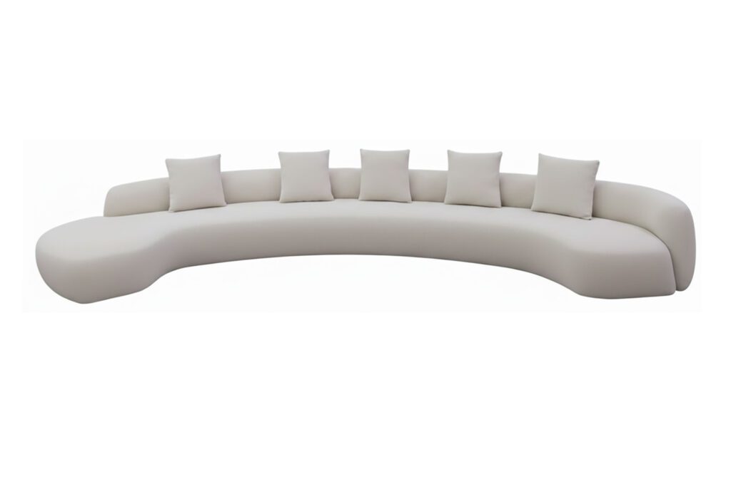 O formato de “abraço” do sofá, juntamente com o estofamento macio e a ausência de braços rígidos, sugere um alto nível de conforto e relaxamento.